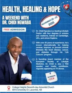 Don’t miss out! Coming to Lacombe, Alberta! 📍College Heights Seventh-day Adventist Church📅 November 20–22, 2025✅ Free Admission | Everyone Welcome 🔴 Livestream available here Meet Dr. Chidi Ngwaba We’re excited