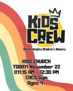 College Heights Children’s Ministry warmly invites all kids to join us for a kids church, fun and engaging time! November 22, 11:15 AM – 12:30 PMCHCS GymAges 4+ Bring your
