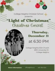 Join College Heights Christian School for their annual Christmas Concert, “Light of Christmas,” on Thursday, December 11 at 6:30 PM at the College Heights SDA Church. Enjoy an evening of
