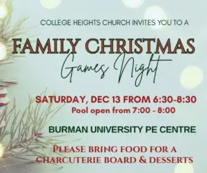 Join us for a joyful Church Family Christmas Party on Saturday, December 13, from 6:30–8:30 PM at the Burman University Gym! Enjoy an evening filled with gym time, pool time,