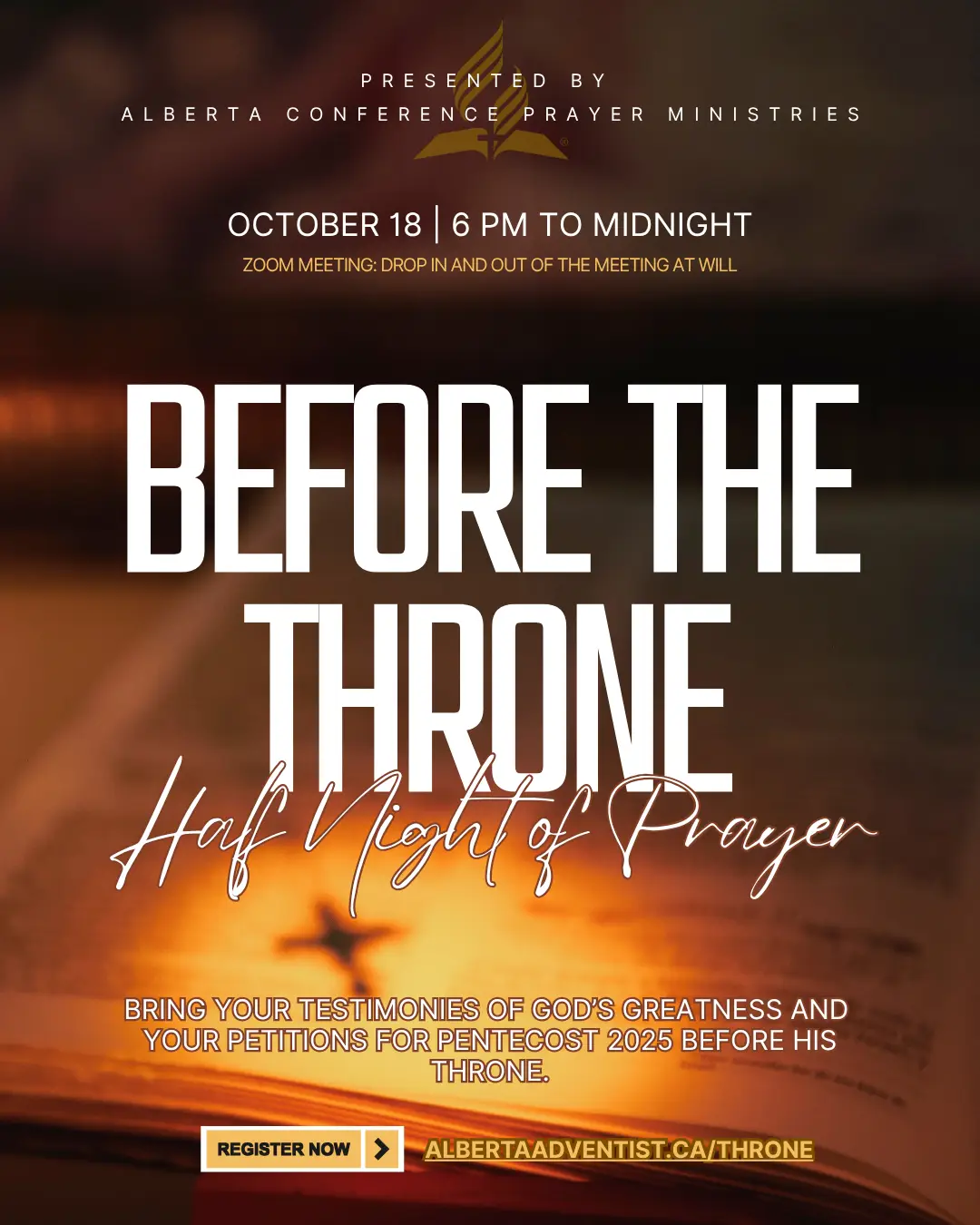 The Alberta Conference Prayer Ministries invites you to join a special Half Night of Prayer titled “Before the Throne” on Friday, October 18, from 6:00 PM to midnight. This is a unique opportunity to come together in worship, prayer, and reflection, lifting up your testimonies of God’s greatness and petitions for Pentecost 2025 before His throne.