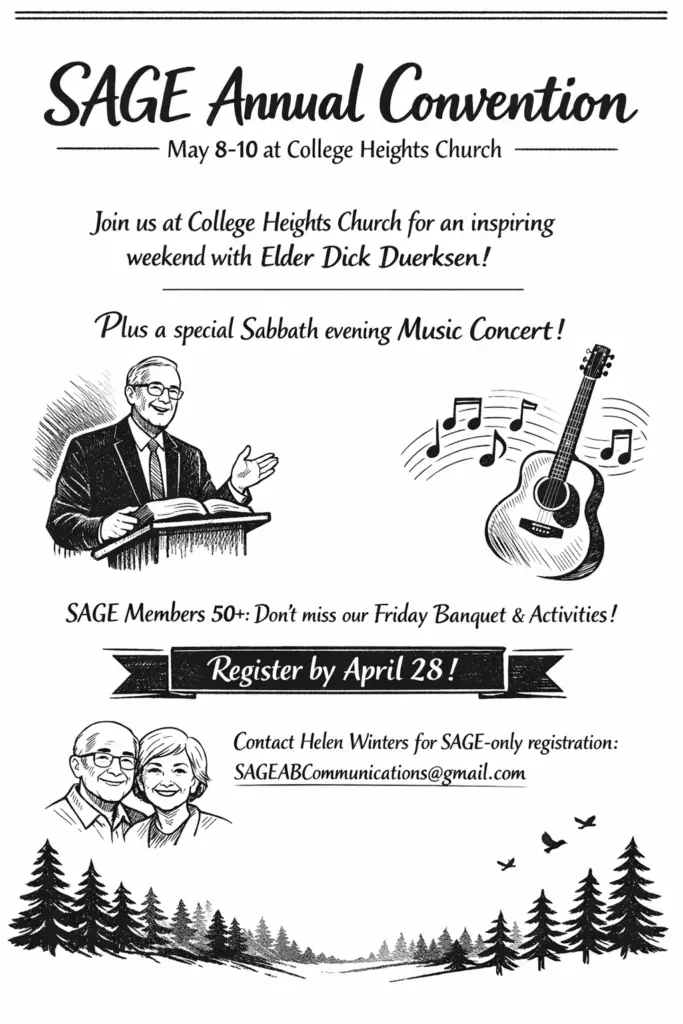 SAGE ANNUAL CONVENTION May 8–10, 2026 | College Heights Church. Join us for an inspiring weekend with Elder Dick Deurkson, featuring four uplifting meetings open to all. You are also warmly invited to the Annual Music Concert on Sabbath evening. For those age 50+, two special SAGE-only events will be held on Friday, including the annual banquet. If you are 50 or over, you are a SAGE member! Registration has been extended to April 28. For registration forms and pricing details, please contact: Helen Winters – [email protected]