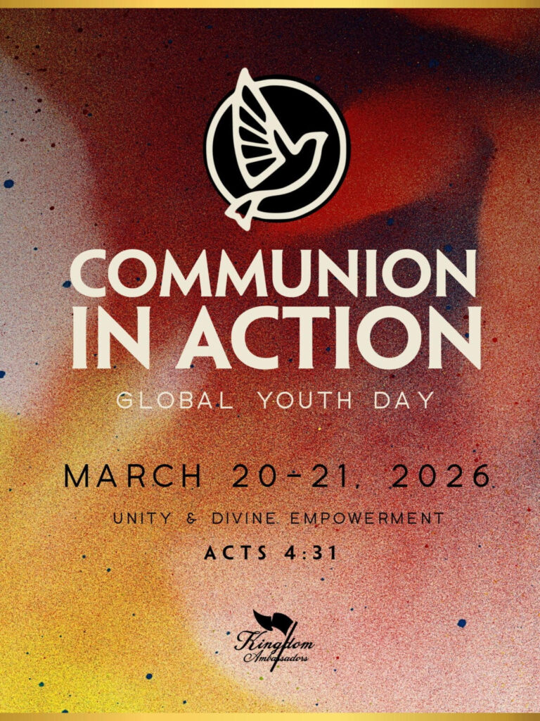 COMMUNION IN ACTION – GLOBAL YOUTH DAY Join us March 20–21, 2026, for Global Youth Day as we come together under the theme Communion in Action. This special weekend will focus on Unity & Divine Empowerment, inspired by Acts 4:31 — “They were all filled with the Holy Spirit and spoke the word of God boldly.” Let’s unite in worship, service, and outreach as we live out our faith in practical ways in our community. Be part of this powerful movement as our youth lead the way in sharing hope and love in action! Mark your calendars and plan to participate!