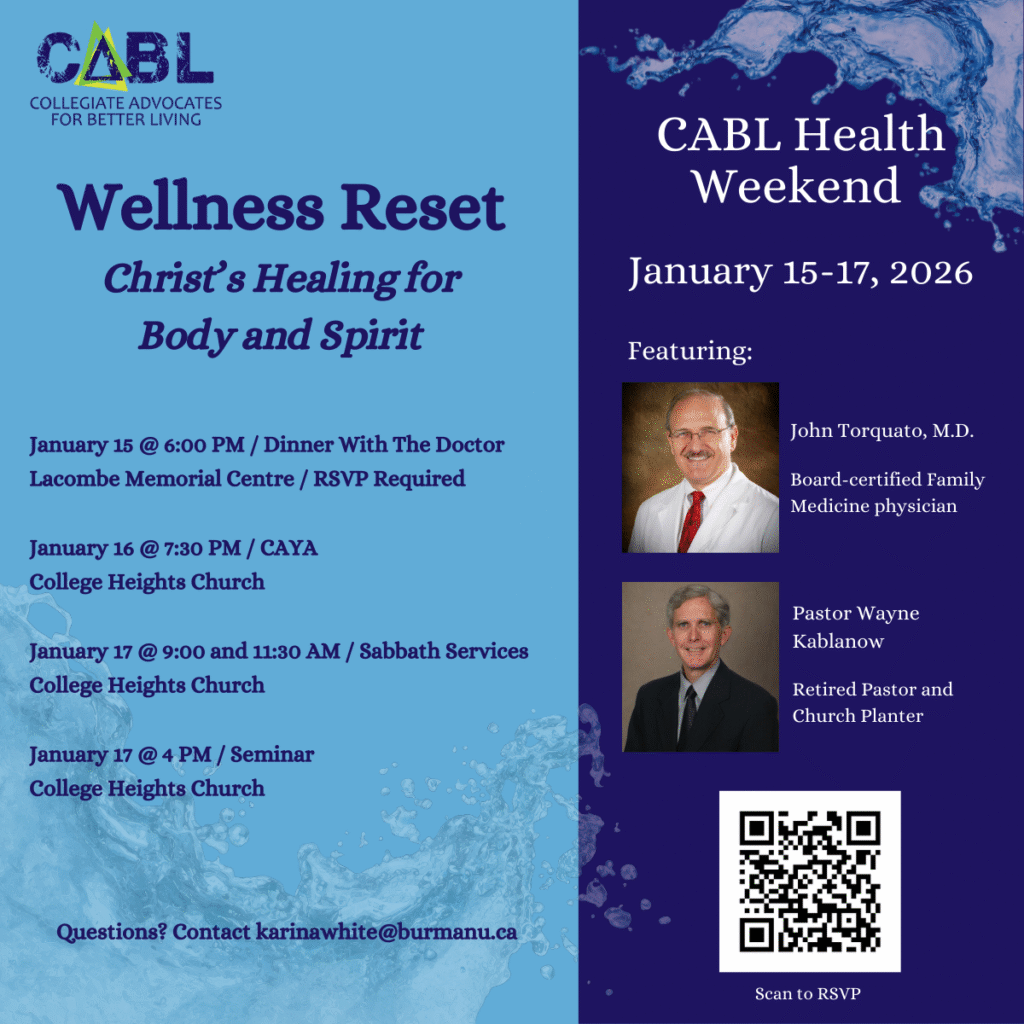 SAVE THE DATE The Collegiate Advocates for Better Living Club invites you to CABL Health Weekend from January 15-17, 2026! We are excited to welcome Dr. John Torquato and Pastor Wayne Kablanow, who will speak on various topics centered around the theme of uniting health and pastoral ministries. RSVP is required for some events. See the posted flyers or contact [email protected] for more information.