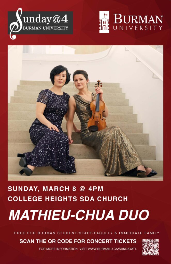 CONCERT Burman’s next Sunday @ 4 concert features two of Canada’s top duo performers, Stephanie Chua (piano) and Veronique Mathieu (violin). Their program features Brahms’ Hungarian Dances and other classical favourites. Sunday, March 8th at 4:00 pm in the church. Admission charge for non-Burman students, staff, faculty & immediate family. Details at www.burmanu.ca/sundayat4.