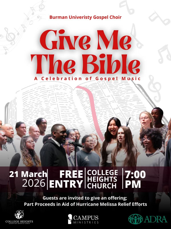 GOSPEL CONCERT The Burman University Gospel Choir is celebrating its 10th year anniversary and is hosting a gospel concert at College Heights SDA on March 21st. The concert is titled: “Give Me The Bible”. It’s a retelling of the Bible from Genesis to Revelation, done through song, instrumentals, dance and spoken word. This is a benefit concert for those affected by Hurricane Melissa last fall. Majority of the proceeds will go to ADRA. Doors open at 6:30pm, Concert starts at 7:00pm.