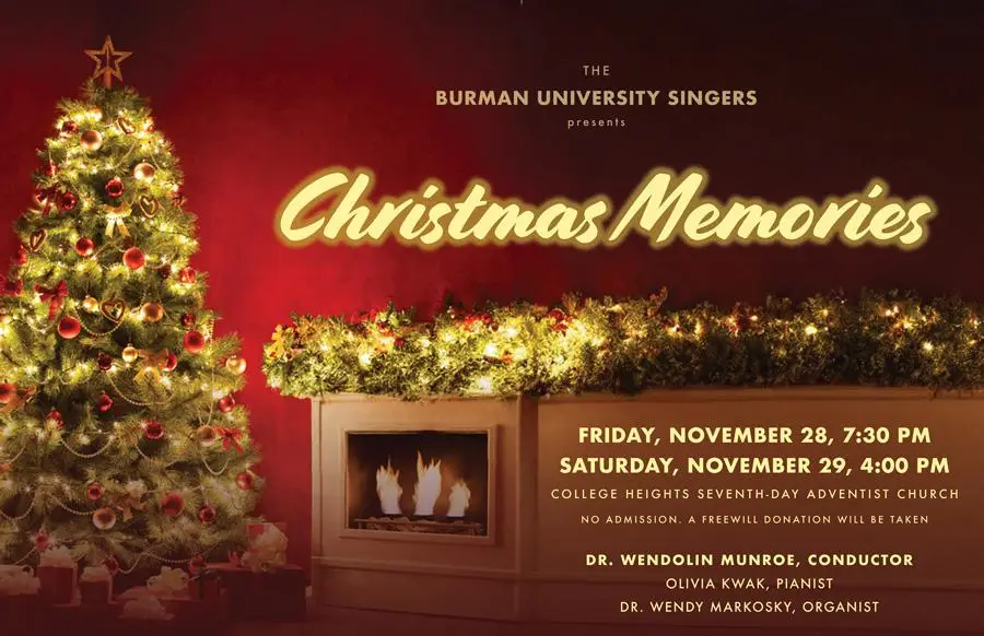 The Burman University Singers warmly invite you to this year’s annual Christmas Vespers concert, Christmas Memories. This cherished seasonal event will feature two performances at the College Heights Church:
