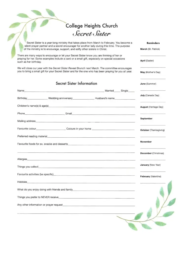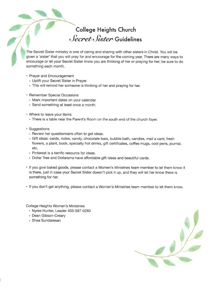 This year-long ministry runs from March to February, during which you’ll become a silent prayer partner and secret encourager for another sister in Christ. Your role is simple but powerful: support, pray for, and uplift your Secret Sister in thoughtful ways throughout the year.