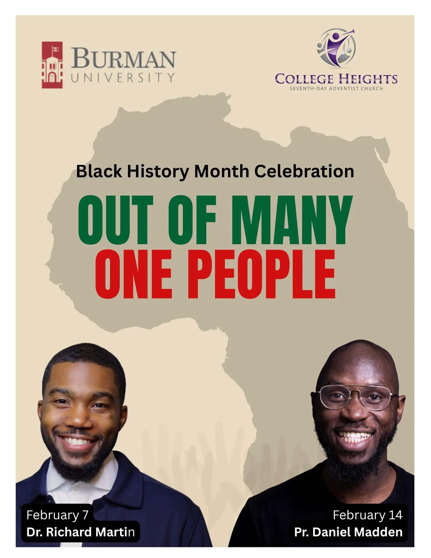 Burman University and College Heights Seventh-day Adventist Church invite the community to a special Black History Month Celebration titled “Out of Many, One People.” This two-part series will highlight faith, heritage, and the beauty of unity within the Black experience.