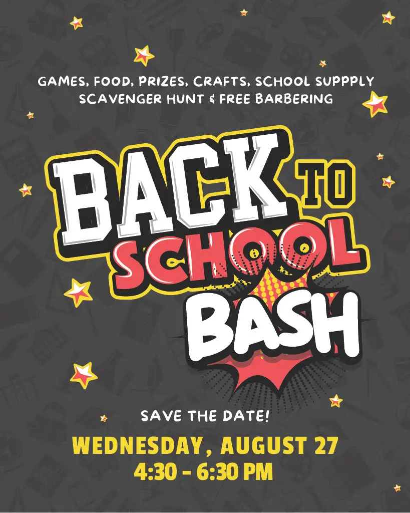 Join us for an afternoon of fun as we get ready for the new school year! Enjoy games, delicious food, exciting prizes, crafts, school supplies, a scavenger hunt, and even free barbering.