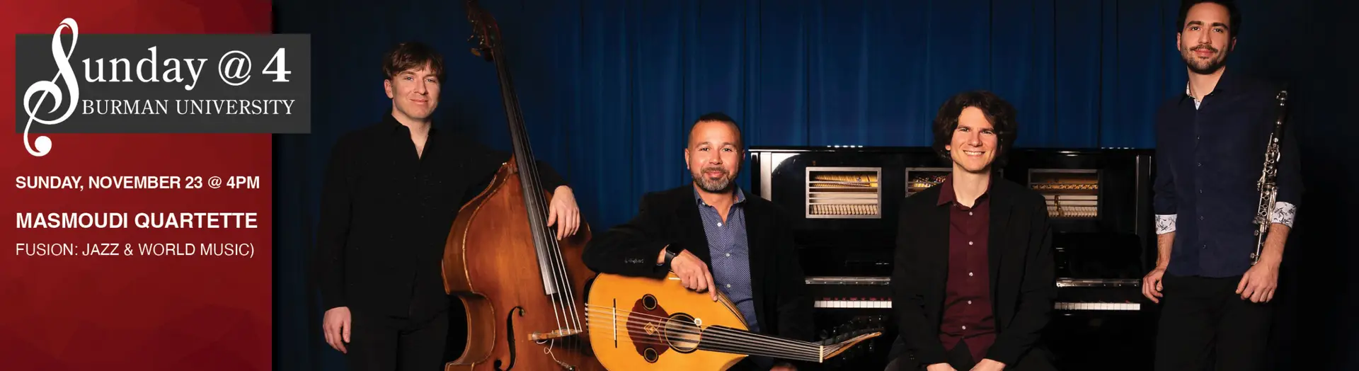 With the Masmoudi Quartette of oud, clarinet, double bass and piano, Western and Middle Eastern cultures meet in a rather extraordinary way! Jazz is infused with a rich interplay of Western and Middle Eastern instrumentation to create a tapestry of sound that is familiar and unexpected at the same time. You’ll be intrigued and mesmerized by a mosaic of classical, jazz, and world music quite unlike any other.